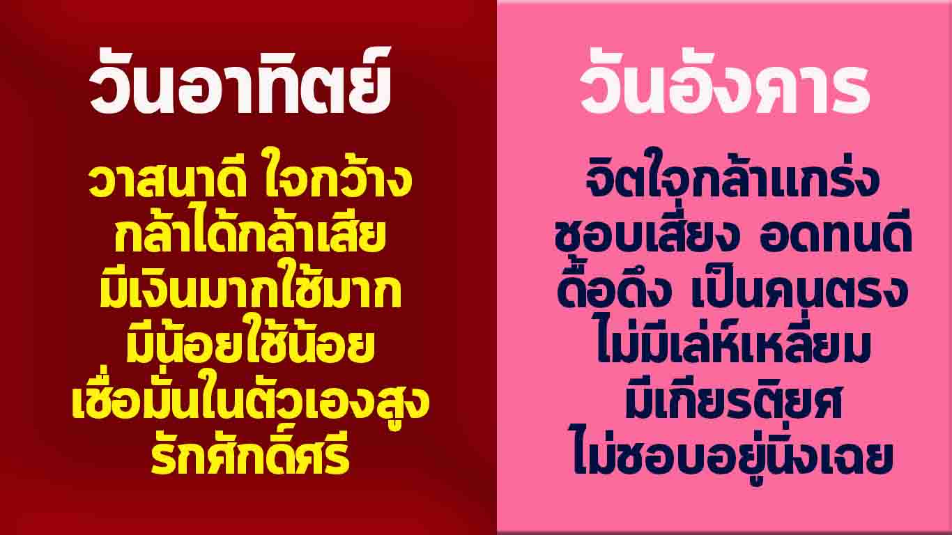 ดวงชะตามักโลดโผน และมักมีประสบการณ์มาก ในชีวิตมักจะมีเกียรติยศ อุปนิสัยคนเกิดวันอังคาร มีจิตใจกล้าแกร่ง ไม่หวาดเกรงใคร เป็นนักต่อสู้ ใจนักรบ โมโหร้าย ใจร้อนวู่วามไม่ยอมคน ชอบมีเรื่องขัดแย้ง