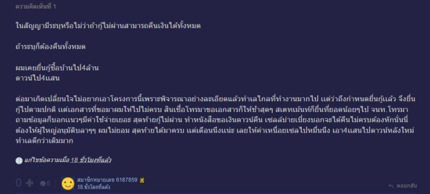 อย่างล่าสุด ทางด้านสมาชิกพันทิปหมายเลข 6300207 ได้สอบถามชาวเน็ตขอคำแนะนำ ทำยังไงดีค่าา อยากขอคืนเงินดาวน์ จำนวนสามแสนกว่าๆ กำลังจะตกงานค่ะ