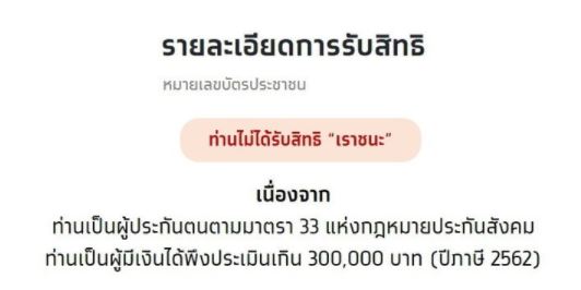 ระบบขึ้นสถานะว่า ท่านไ ม่ได้รับสิทธิ์เราชนะ เนื่องจากเป็นผู้ประกันตนมาตรา 33 ของสำนักงานประกันสังคม และมีเงินได้พึงประเมินเกิน 300,000 บาท
