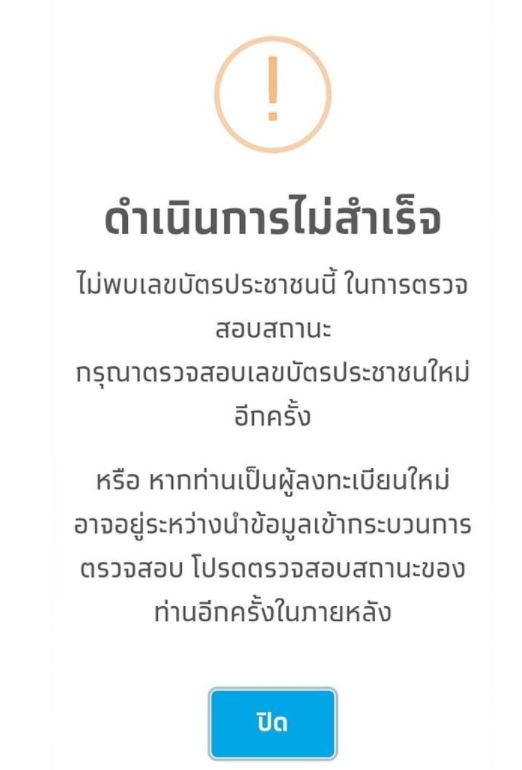 ระบบขึ้นสถานะว่า ดำเนินการไ ม่สำเร็จ พร้อมให้เห ตุผลว่าไ ม่พบเลขบัตรประชาชนดังกล่าว หรืออยู่ในกลุ่มผู้ลงทะเบียนใหม่ซึ่งกำลังตรวจสอบ