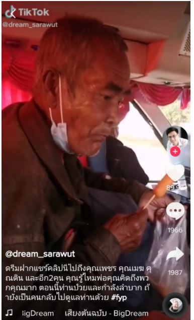 ทั้งนี้แม้ว่าคุณตาจะป่ วยเป็นโร คกล้ามเนื้ ออ่อนแร งก็ไ ม่เคยมีลูกๆ คนไหนคิดกลับมาดูแลผู้เป็นพ่อแม้แต่น้อย จึงยอมเสี่ ยงขึ้นมากรุงเทพเพื่อเจอลูกด้วยเงินไ ม่กี่ร้อย แต่ก็ได้รับความผิ ดหวังกลับไป โดยเงินที่ติดตัวคุณตาในขณะกลับบ้านที่ร้อยเอ็ดเหลืออยู่เพียง 100 บาทเท่านั้น หนุ่มรายนี้จึงได้มอบเงินให้คุณตานำไปใช้จำนวนหนึ่งก่อนจะซื้อของให้ทานระหว่างเดินทาง