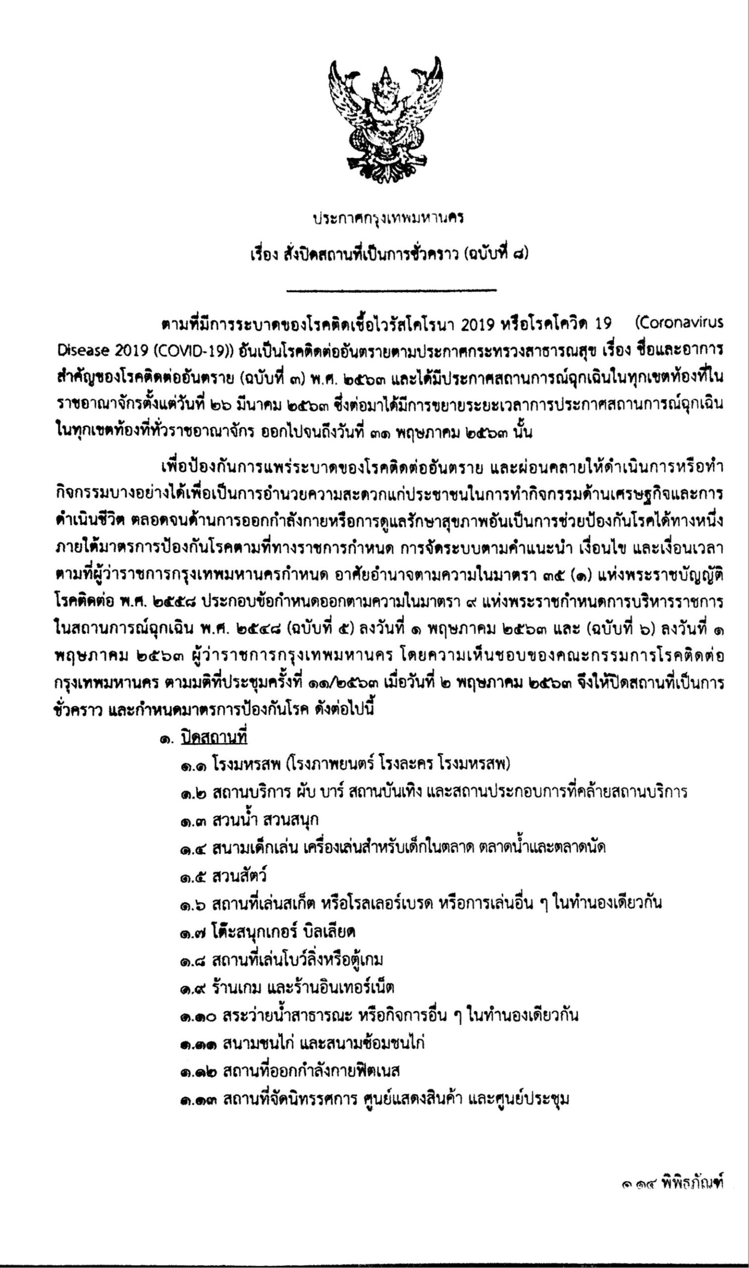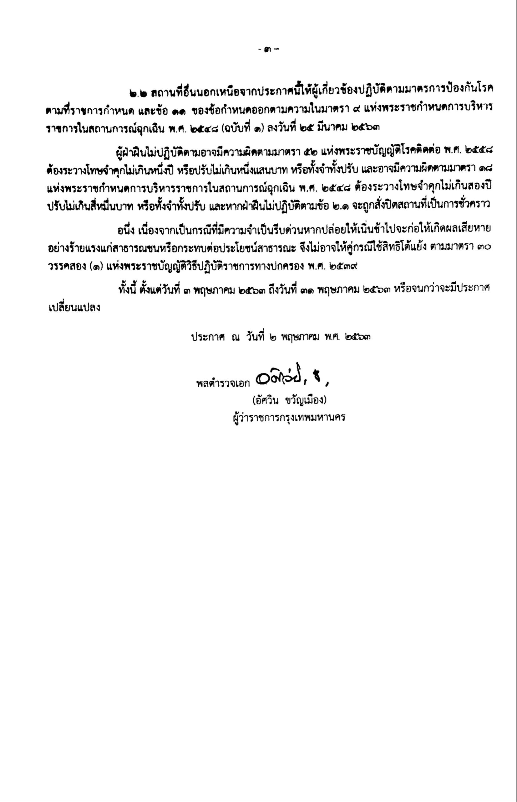 เมื่อวันที่ 3 พ.ค. ผู้สื่อข่าวรายงานว่า เมื่อวันที่ 2 พ.ค. ที่ผ่านมา พล.ต.อ.อัศวิน ขวัญเมือง ผู้ว่าราชการกรุงเทพมหานคร (กทม.) ลงนามประกาศปิดสถานที่ เ สี่ ย ง เป็นการชั่วคราว ฉบับที่ 8 ถึง 31 พ.ค.2563 หรือจนกว่าจะมีคำสั่งเปลี่ยนแปลง พร้อมกำหนดมาตรการป้องกัน โ ร ค ตามที่คณะกรรมการโรคติดต่อกรุงเทพมหานครอนุมัติ