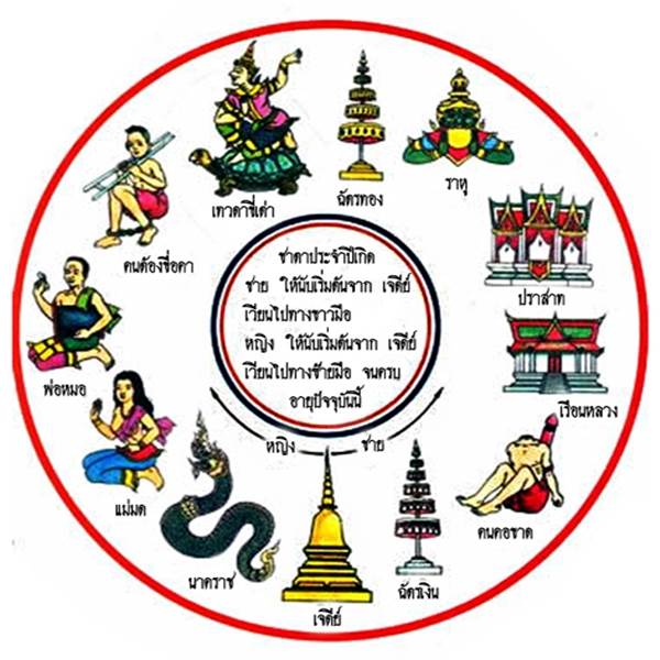 ถ้าท่านเป็นหญิง ก็ให้เริ่มนับต้น อายุจากเจดีย์เช่นกัน โดยเจดีย์ คือ ปีที่ 1 เวียนไปทางซ้าย (ทวนเข็มนาฬิกา) จนครบอายุปัจจุบันของท่าน
