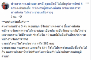 ได้ระบุข้อความว่า คนไทยไม่ทิ้งกัน คนงานก่อสร้าง 3 คน พ่อแม่บุตร ขี่จักรยานหลงทาง ขึ้นทางพิเศษ พนักงานจัดการจราจรได้ตรวจสอบ