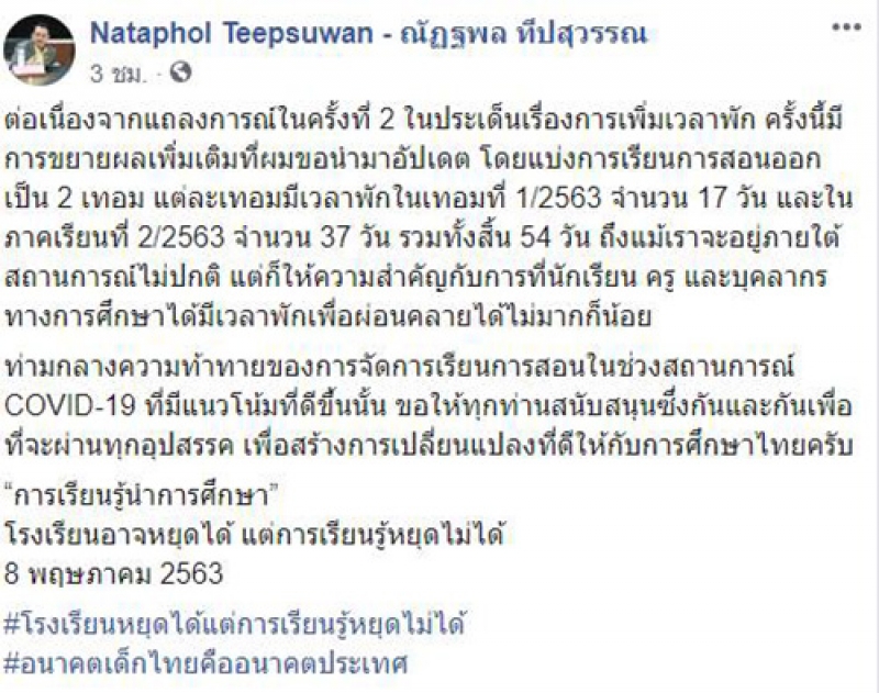 วันที่ 8 พฤษภาคม 2563 นายณัฏฐพล ทีปสุวรรณ รัฐมนตรีว่าการกระทรวงศึกษาธิการ ได้โพสต์ภาพและข้อความผ่านเฟซบุ๊ก Nataphol Teepsuwan ณัฏฐพล ทีปสุวรรณ ระบุถึงแนวทางการเปิด ปิด ภาคเรียนในสถานศึกษา โดยเพิ่มเวลาพัก 54 วัน จากเดิมที่ไม่มีเวลาปิดเทอมระหว่างภาคเรียน