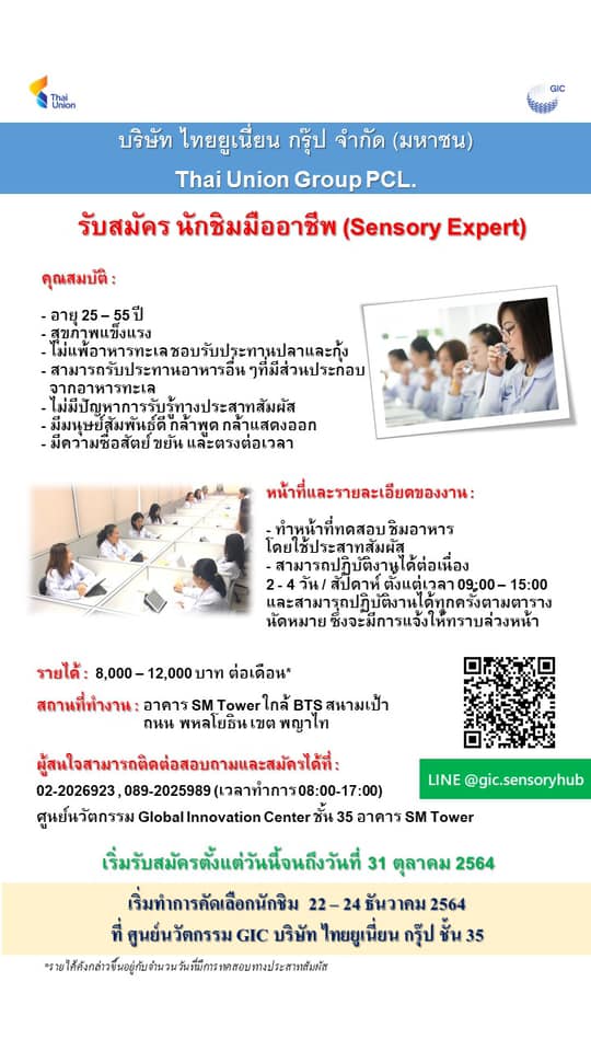 “ ประกาศ ประกาศ โอกาสดีๆมาถึงแล้วค่าาา สำหรับใครที่มีคนรู้จักที่ชื่นชอบในการชิมอาหาร เชิญมาร่วมเป็นส่วนหนึ่งในโครงการสุดยอดนักชิมกับเรา ติดต่อมาได้เลยค่ะ เพียงมีคุณสมบัติตามประกาศด้านล่างนี้ ผู้ที่ผ่านการคัดเลือกจะได้รับการฝึกฝนเป็นนักชิมพร้อมรับค่าตอบแทนประจำจากเราไปเลยค่ะสอบถามข้อมูลเพิ่มเติมได้ที่ LINE @gic.sensoryhub ”