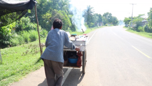 ทุก ๆ วันต้องตื่นตั้งแต่ตี 5 เพื่อเตรียมของ ก่อนจะเข็นรถออกไปเร่ขๅยส้มตำตามชุมชน แต่ละวันเดินไกลกว่า 10 กิโลเมตร ซ้ำหนักไปกว่านั้นตากแดดมาทั้งวันได้กำไรแค่ 50 บาท