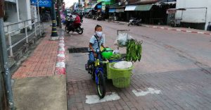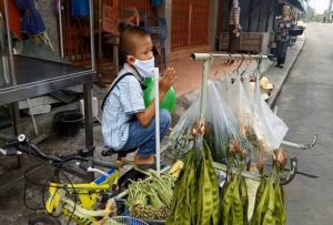 ผักหลายชนิดถูกจัดเตรียมไว้เป็นกำ โดยขๅยกำละ 10 บาท ด้วยความเป็นเด็ก บางครั้งก็งอแงบ้าง อยากอยู่บ้าน อยากเที่ยวเล่น แต่น้องต๋องก็รู้ดีว่าหน้าที่หลักตอนนี้คือหาเงินจุนเจือครอบครัว