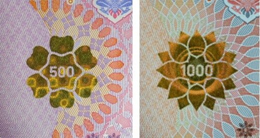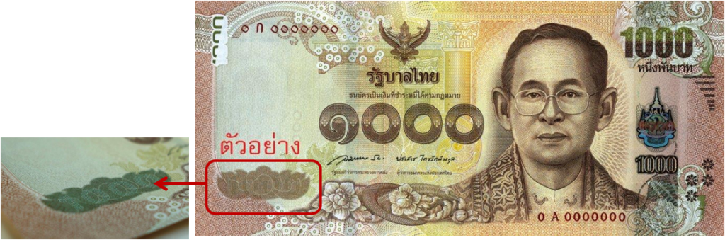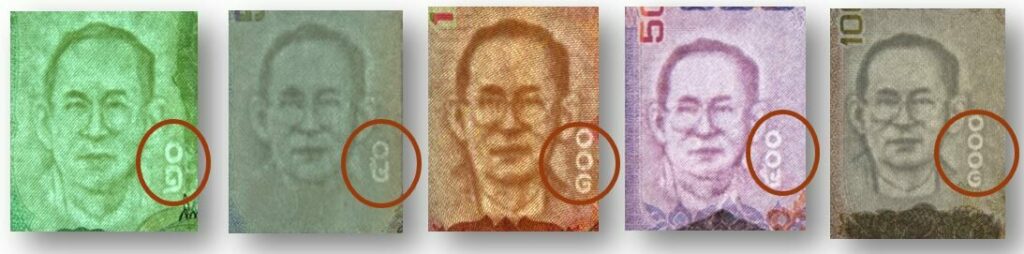 ตัวเลขแจ้งชนิดราคาซ่อนอยู่ในลายประดิษฐ์ มองเห็นได้เมื่อเอียงธนบัตรเข้าหาแสงสว่าง