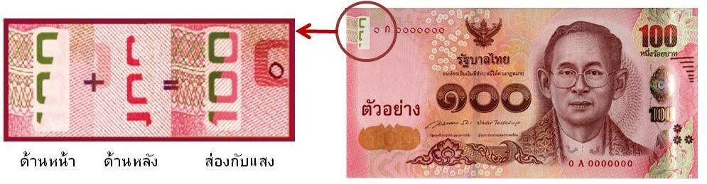 ธนบัตรแบบ 17 (ชนิดราคา 100 บาท) ลวดลายจัดเรียงกันในแนวตั้ง เมื่อพลิกเปลี่ยนมุมมองจะเห็นเป็นสีเหลือบเหลือง