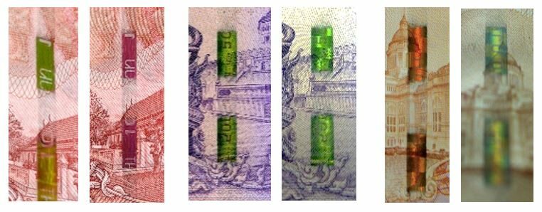 ผนึกไว้ตามแนวตั้ง ภายในมีภาพที่เป็นมิติ เมื่อพลิกเอียงธนบัตรไปมาจะเห็นองค์ประกอบต่างๆ ในแถบฟอยล์เคลื่อนไหว และเปลี่ยนสีสะท้อนแสงวาววับสวยงาม