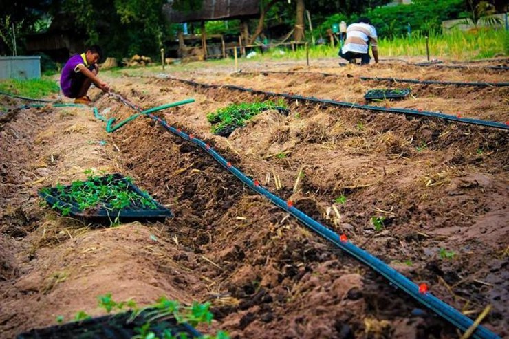 มื่อดินเริ่มฟื้นสภาพ เดินระบบน้ำ โชคดีที่นี่มีบ่อน้ำบาดาลหมู่บ้านใช้ได้เลย ไม่เค็มเหมือนที่อื่น แต่ต้องใช้อย่างประหยัด