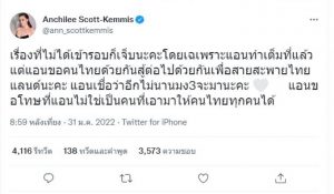 เรื่องที่ไม่ได้เข้ารอบก็เจ็บนะคะโดยเฉพาะแอนทำเต็มที่แล้ว แต่แอนขอคนไทยด้วยกันสู้ต่อไปด้วยกันเพื่อสายสะพายไทยแลนด์นะคะ แอนเชื่อว่าอีกไม่นานมง3จะมานะคะ แอนขอโทษที่แอนไม่ใช่เป็นคนที่เอามาให้คนไทยทุกคนได้
