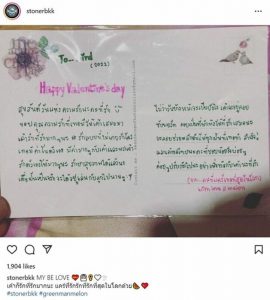โดยการ์ดเขียนข้อความว่า “Happy Valentine’s day สุขสันต์วันแห่งความรักนะคะที่รัก ขอบคุณความรักที่เธอมีให้เค้าเสมอมา เค้ารักที่รักมากๆ นะ #รักแบบที่ไม่เคยรักใคร เธอมีค่าในตัวเอง มีค่ามากๆ กับเค้าและพระเจ้า รักตัวเองให้มากๆ นะ รักษาสุขภาพได้แล้วนะ เผื่อฝันเป็นจริงจะได้อยู่เล่นกับลูกไปนานๆ