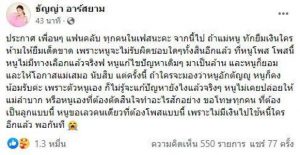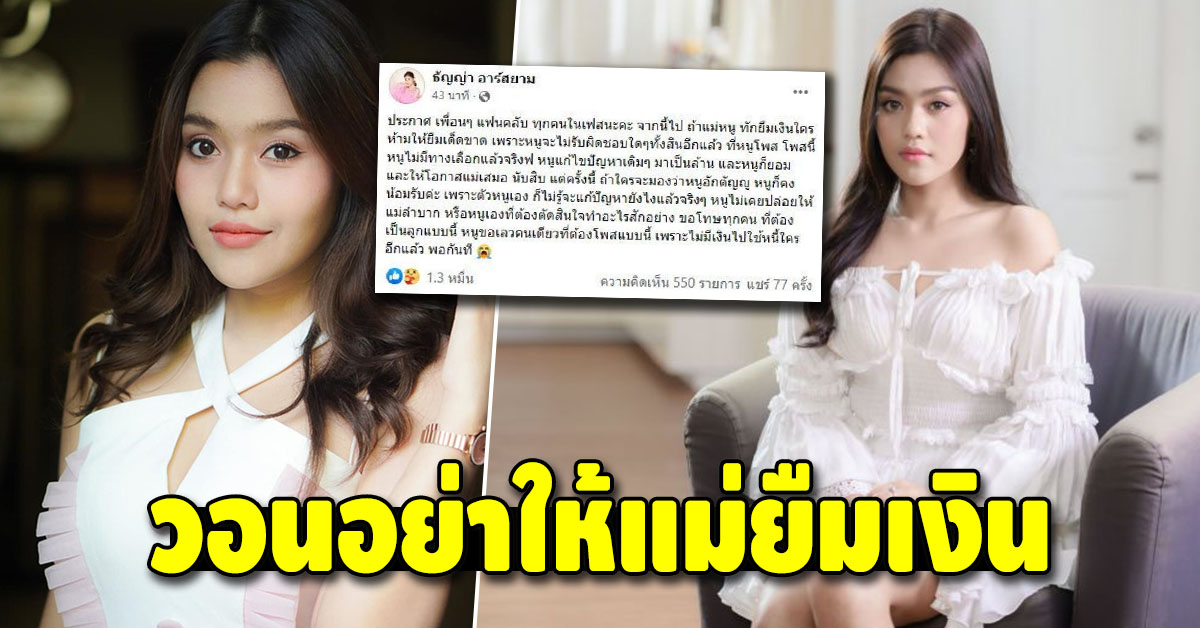 ระบุว่า ประกาศ เพื่อนๆ แฟนคลับ ทุกคนในเฟสนะคะ จากนี้ไป ถ้าแม่หนู ทักยืมเงินใคร ห้ามให้ยืมเด็ดขาด เพราะหนูจะไม่รับผิดชอบใดๆทั้งสินอีกแล้ว ที่หนูโพส โพสนี้ หนูไม่มีทางเลือกแล้วจริงๆ หนูแก้ไขปัญหาเดิมๆ มาเป็นล้าน และหนูก็ยอม และให้โอกาสแม่เสมอ นับสิบ