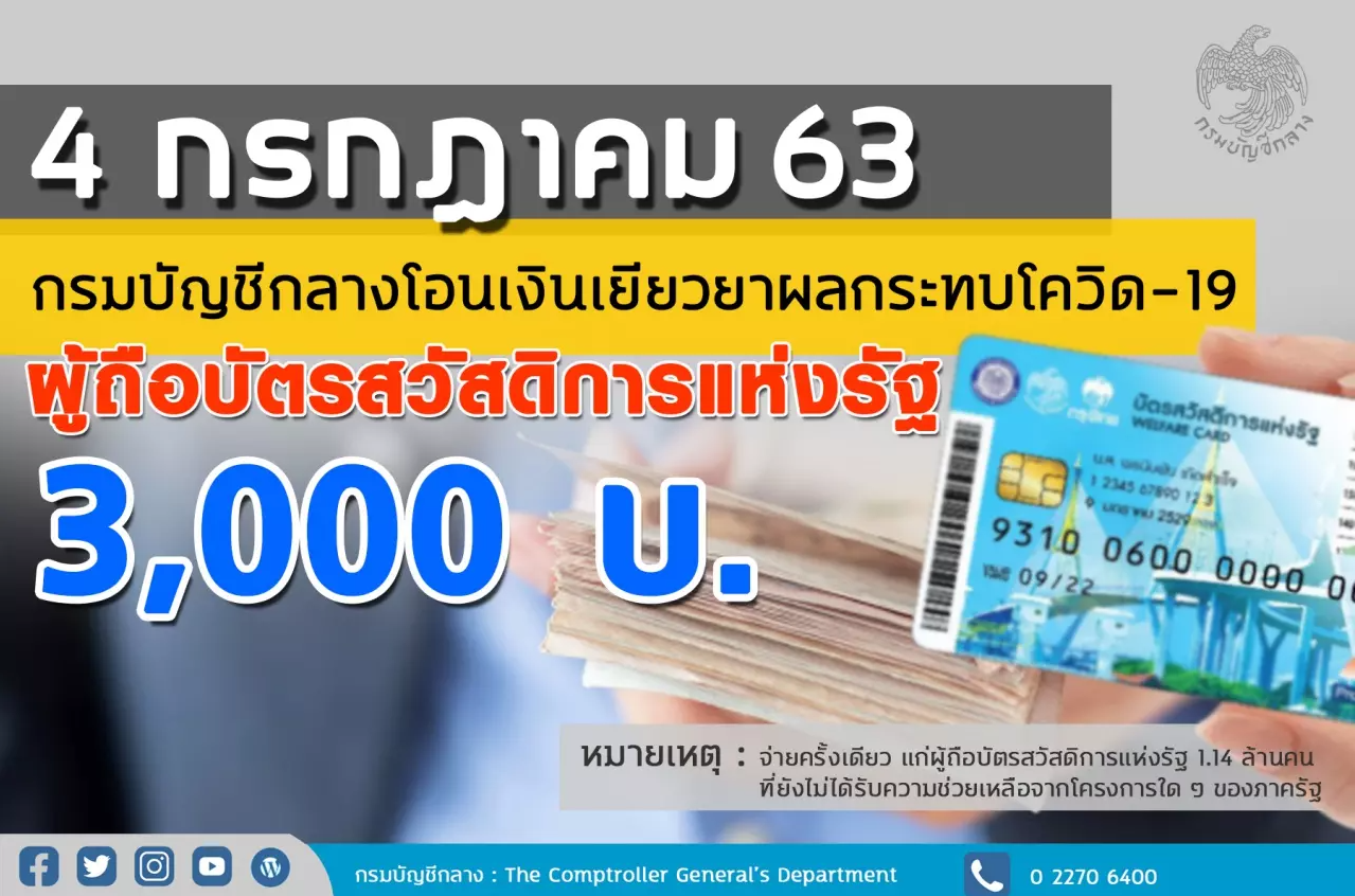 อย่างไรก็ตาม กรมบัญชีกลางได้ดำเนินการเบิกเงินแทนสำนักงานเศรษฐกิจการคลัง เพื่อจ่ายให้แก่ผู้มีสิทธิ์ โดยการโอนเงินเข้ากระเป๋าเงินอิเล็กทรอนิกส์ (e-Money) ในบัตรสวัสดิการแห่งรัฐ จำนวน 3,000 บาท (สามารถถอนออกมาเป็นเงินสดได้ ผ่านตู้ ATM ของธนาคารกรุงไทย) ซึ่งจ่ายเพียงครั้งเดียว ในวันที่ 4 กรกฎาคม 2563 ทั้งนี้ สามารถสอบถามรายละเอียดเพิ่มเติมได้ที่ Call Center กรมบัญชีกลาง 02 270 6400 ในวัน เวลาราชการ