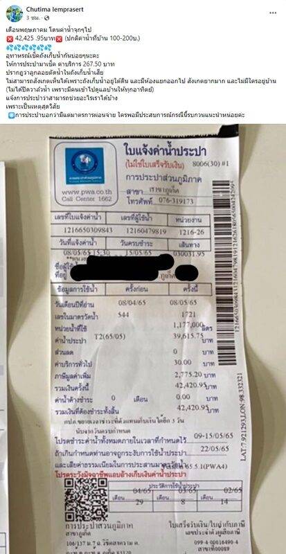 ล่าสุด วันที่ 9 มิ.ย.65 สมาชิกเฟซบุ๊ก “Chutima Iemprasert” ได้โพสต์ภาพบิลค่าน้ำเดือน พ.ค.ที่สูงถึง 4 หมื่นกว่าบาท ทั้งที่ปกติอยู่ที่ 100-200 บาท โดยระบุข้อความว่า