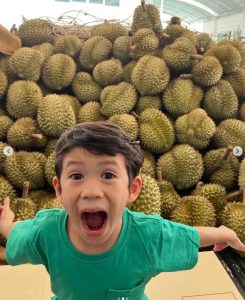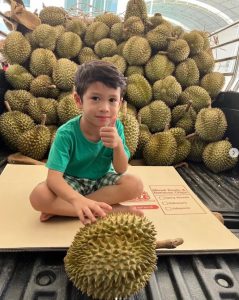 น้องโพธิ์ เจ้าของสวนตัวจริง นั่งขๅยทุเรียนช่วยพ่อแม่