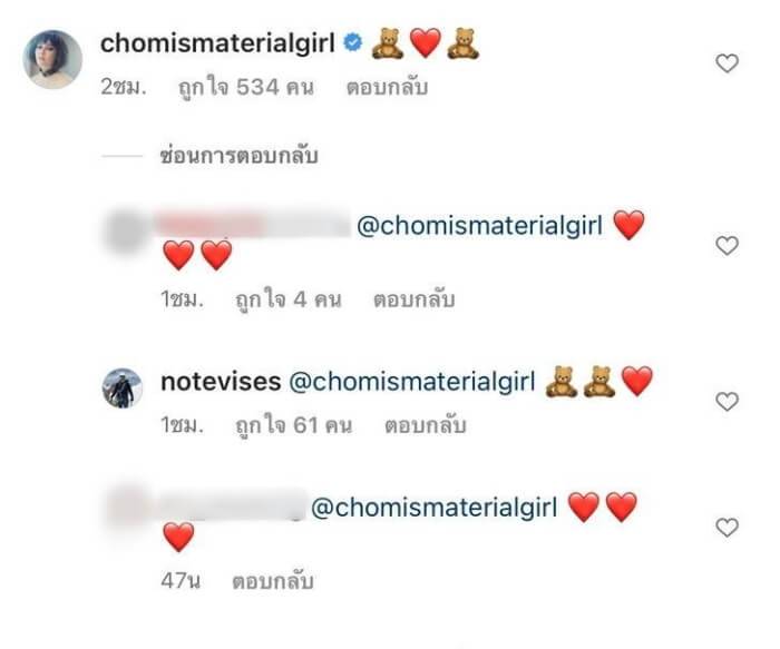 พร้อมด้วยสะใภ้ใหญ่ อย่าง ชมพู่ อารย า ที่ได้เข้ามาคอมเมนต์เป็นรูปอิโมจิน่ารัก ๆ เป็นรูปหมีสองตัวและหัวใจ ครอบครัวรังษีสิงห์พิพัฒน์ น่ารักอบอุ่นมากจริง ๆ