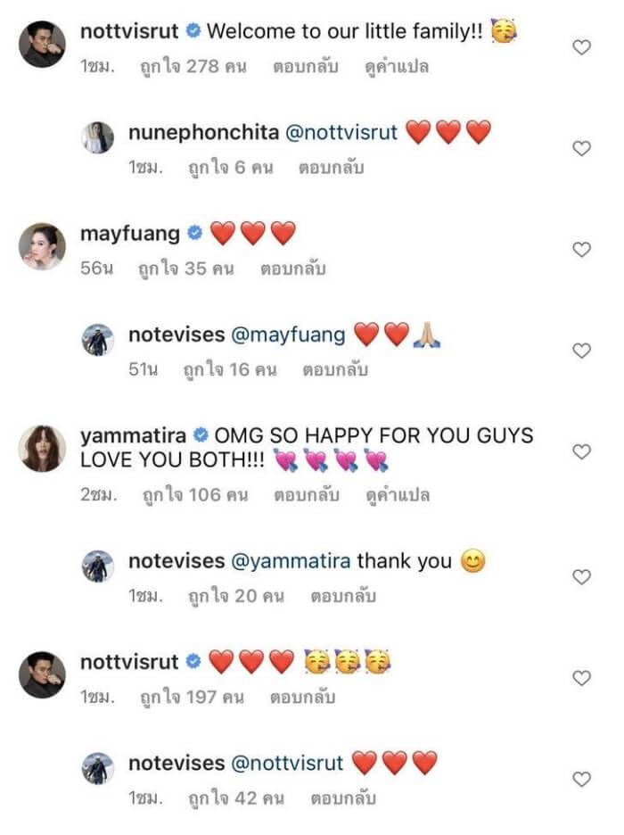 ทางด้านพี่ชายของโน้ต อย่าง น็อต วิศรุต ก็ได้แสดงความยินดีกับทั้งคู่ ด้วยการโพสต์สตอรี่ไอจี และยังคอมเมนต์ต้อนรับว่าที่น้องสะใภ้ด้วยข้อความสั้น ๆ แต่อบอุ่นว่า “Welcome to our little family!”