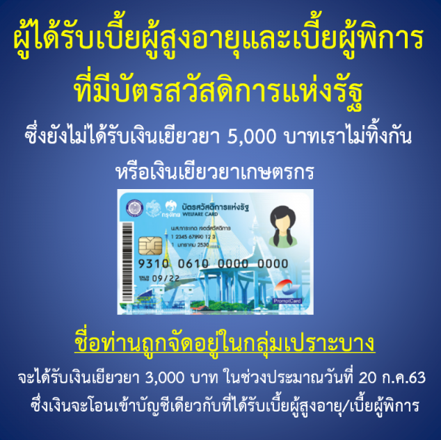 ผู้ที่ได้รับเงินเบี้ยสูงอายุ และเงินเบี้ยผู้พิ การ ที่มีบัตรสวัสดิการแห่งรัฐ ซึ่งยังไม่ได้รับเงินช่วยเหลือ 5,000 บาท เราไม่ทิ้งกัน หรือเงินช่วยเหลือเกษตรกร ชื่อท่านถูกจัดอยู่ในกลุ่มเปราะบาง จะได้รับเงินช่วยเหลือ 3,000 บาท ในช่วงประมาณวันที่ 20 กรกฎาคม 2563 ซึ่งเงินจะโอนเข้าบัญชีเดียวกับที่ได้รับเบี้ยผู้สูงอายุ หรือเบี้ยผู้พิ การ