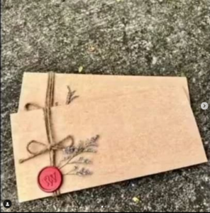 ตัวการ์ดเป็นสีน้ำตาล ผูกด้วยเชือกป่านและตกแต่งด้วยดอกไม้แห่ง ประทับด้วยตราประทับครั่งหรือขี้ผึ้งโบราณสีแดง เก๋มากๆ เป็นฟีลธรรมชาติสุดๆ