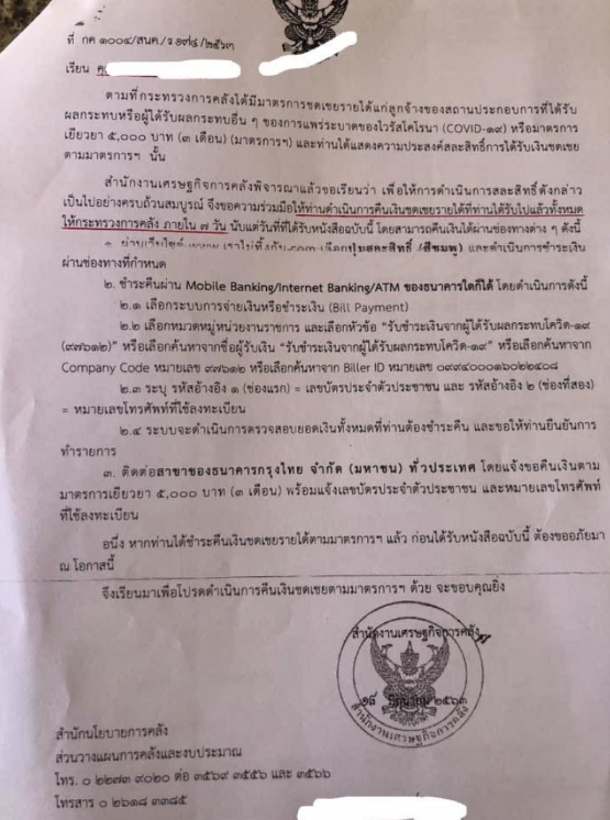 ขอให้ท่านดำเนินการคืนเงินชดเชยรายได้ที่ท่านได้รับแล้วทั้งหมด ภายใน 7 วัน นับแต่วันที่ได้รับหนังสือ และให้ชำระเงินผ่านช่องทาง โมบาย แบงก์กิ้ง และเอทีเอ็มของธนาคารใดก็ได้นั้ น