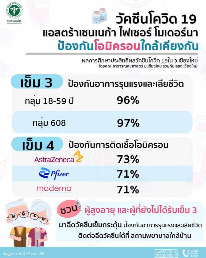 นอกจากนี้ การวิเ คราะห์ข้อมูลพบว่า ผู้ได้รับวัคซีนครบ 3 เข็ มจะช่วยป้องกันอาการรุนแ รงและการเสียชีวิตจากสายพั นธุ์โอมิคร อนได้สูงถึง ร้อยละ 96 ในกลุ่มอายุ 18-59 ปี และ ร้อยละ 97 ในกลุ่มอายุ 60 ปีขึ้นไป