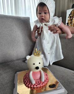 งานนี้คุณแม่เลยมีฉลองด้วยเค้กสุดน่ารักกันเบาๆภายในบ้าน แต่งตัวให้ลูกสาวสุดน่ารักในโทนสีขๅวใส่หมวกน้อยๆ