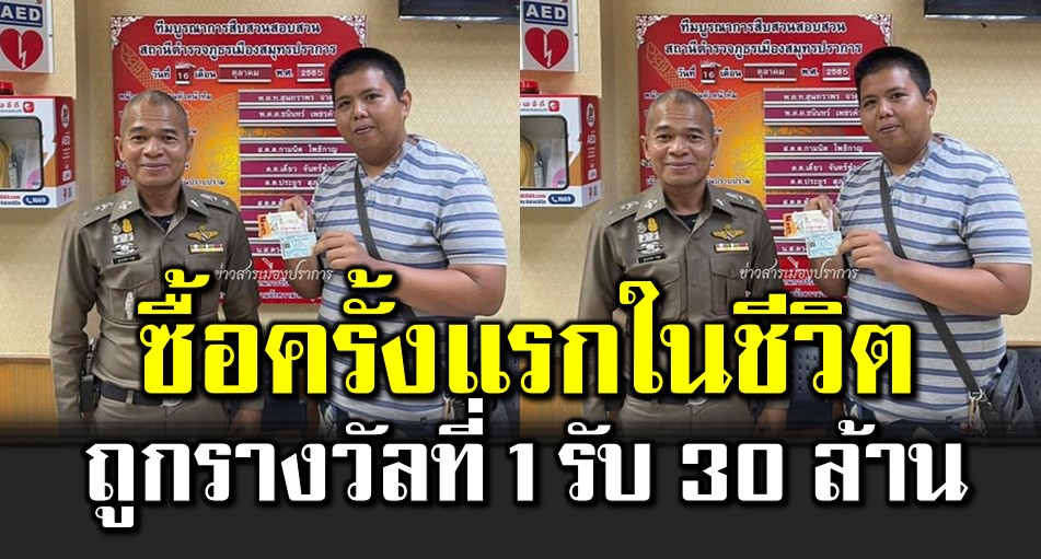 หนุ่มดวงเฮง ลองซื้อหว ยครั้งแรกในชีวิต ถูกรางวัลที่ 1 จำนวน 5 ใบ รวยเละ รับเหนาะ ๆ 30 ล้านบาท นำลอตเตอรี่มาลงบันทึกประจำวันที่ สภ.เมืองสมุทรปราการ