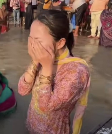 แล้วจัดการจุ่มศีรษะลงในแม่น้ำคงคา ก่อนจะกวักน้ำขึ้นมาล้างใบหน้า