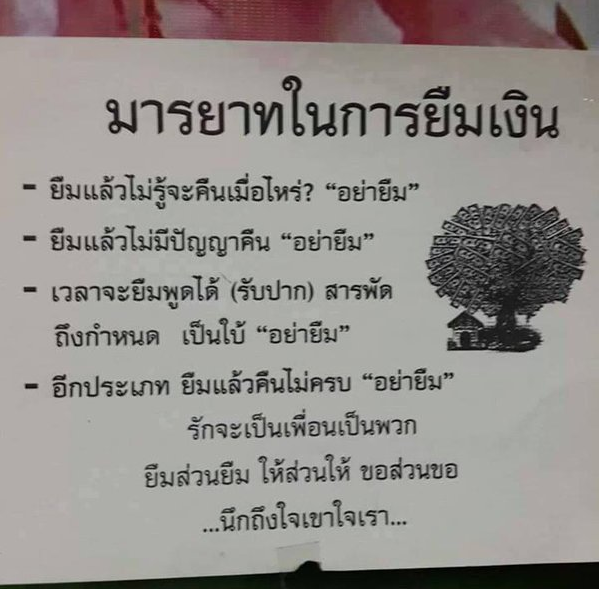 บางคนยืมด้วยความตั้งใจไม่คืนตั้งแต่แรก แต่มาหว่านล้อมล่อหลอกว่าจะคืน พร้อมดอกเบี้ยมหาศาลบานตะไท ที่มายืมตรงนี้ก็เพียงเพราะ อยากประชดแบงก์ที่กู้ย ากกู้เย็นนัก อันนี้ผิดศีลข้อ ๒ เต็มๆ