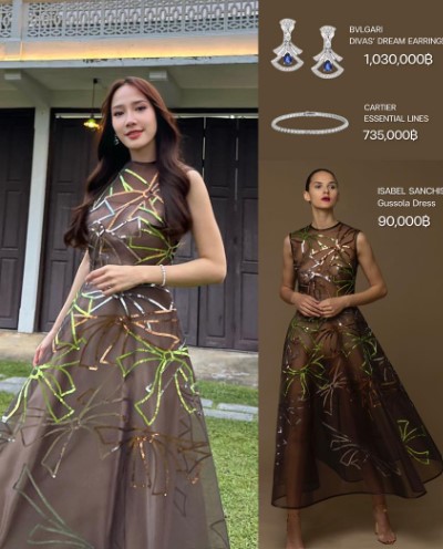 เเละต่างหูจากเเบรนด์ BVLGARI DIVAS’ EARRINGS ราคาอยู่ที่ 1,030,000 บาท ซึ่งรวม ๆ แล้วราคาทั้งลุคก็คือ 1,855,000 บาท