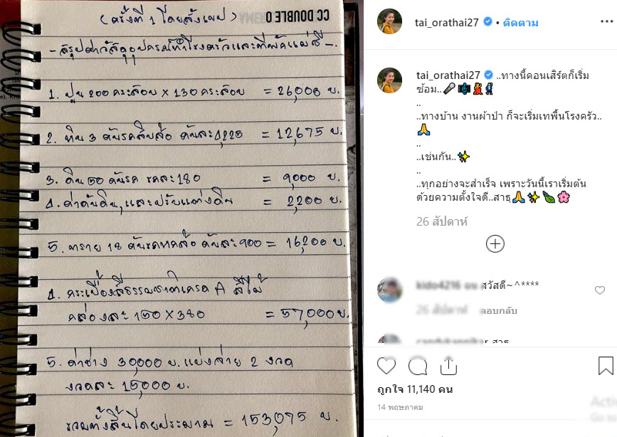 โดย สาวต่าย นั้นได้โพสต์ระบุข้อความลงไอจีส่วนตัวว่า ทางนี้คอนเสิร์ตก็เริ่มซ้อม ทางบ้าน งานผ้าป่า ก็จะเริ่มเทพื้นโรงครัว เช่นกัน ทุกอย่างจะสำเร็จ เพราะวันนี้เราเริ่มต้นด้วยความตั้งใจดีสาธุ และยังได้โพสต์ค่าใช้จ่ายทั้งหมดในการสร้างโรงครัวครั้งที่ 1 ซึ่งมีมูลค่าถึง 153,057 แสนบาท