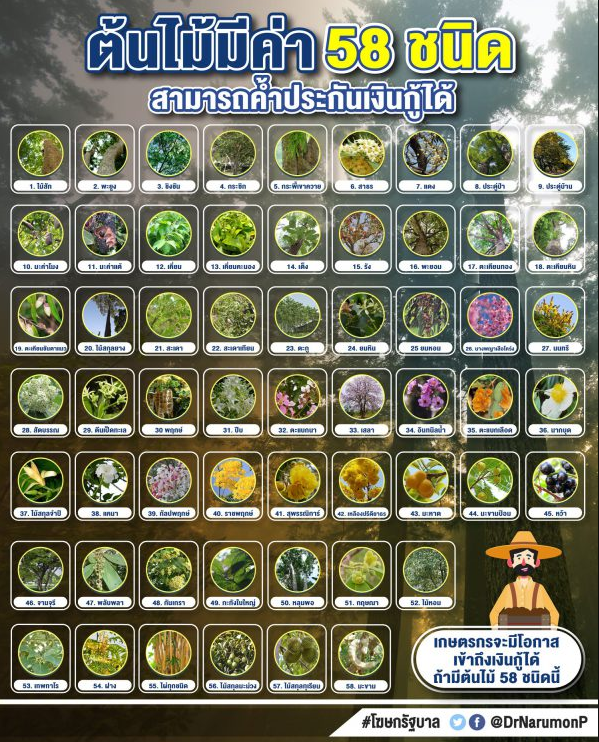 ข่าวดีสำหรั บเกษตรกร และผู้ที่ต้องกา ร กู้ยืมเงินจากสถาบันการเงินเพื่อไปทำธุรกิจต่อย อด เพราะรัฐบาลไฟเขียว เปิดทางให้นำไม้ยืนต้นที่มีมู ลค่ าทางเศร ษฐกิ จทั้งหมด 58 ชนิด นำมาเป็นหลักประกันเพื่อกู้ยืมเงินได้