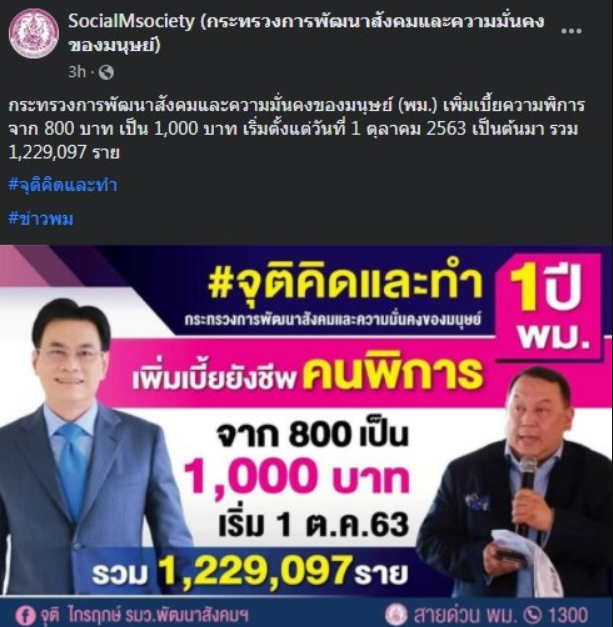 โดยทางแฟนเพจ SocialMsociety กระทรวงการพัฒนาสังคม และความมั่นคงของมนุษย์ (พม.) ได้ออกมาเปิ ดเผยว่า พม.ได้เตรียมเพิ่ม เบี้ยความพิกา ร จาก 800 บาท เป็น 1,000 บาท รวม 1,229,097 ราย โดยจะมีผล ตั้งแต่วันที่ 1 ตุลาคม 2563 นี้ เป็นต้นไป