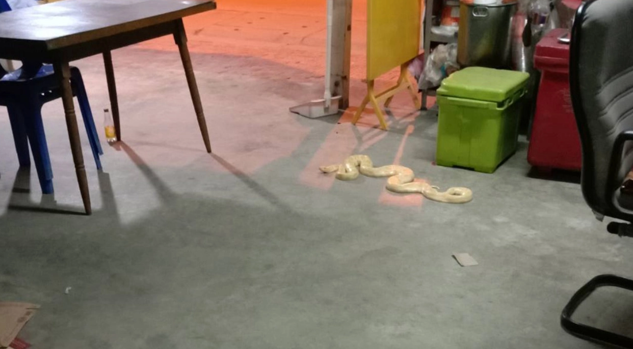 ทั้งนี้ เจ้าหน้าที่กู้ภัยฯ ใช้เวลาประมาณครึ่งชั่ วโมงจึงจับได้ พบเป็นงูเหลือมเพ ศเมีย สีทอง หรือสีเผือก ย าวประมาณ 1 เมตรครึ่ง น้ำหนัก 3 กิโลกรัม 2 ขีด จึงจับใส่ถุงเพื่อนำไปมอบให้กับสวนสัตว์เปิดเขาเขียวศรีราชา