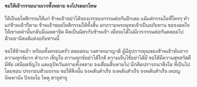 ฝันเห็นผู้หญิงใส่ชุดสีชมพูแดงมานั่งคุยด้วย เธอบอกว่า เมื่อก่อนโกรธเรามากแต่มาวันนี้ ไม่โกรธแล้วพอเราตื่นขึ้นมาเรารู้สึกว่าอิ่มเอมใจแบบอธิบายไม่ถูก คุยกับแม่ แม่ว่าคงเป็นเจ้ากรร มนายเวรเขามาอโหสิกรร มให้ก็เลยไปเล่าให้เพื่อนสนิทฟังเพื่อนก็เลยขอให้ส่งบทสวดบทนั้นให้พอเพื่อนเราสวด เธอก็ฝันเห็น เด็กตัวเล็ก เล็ก บอกเธอว่าเขากำลังจะไปเกิ ดเธอบอกว่า เธอรู้สึกดีมาก มาก ก็เลยอย ากจะแช ร์บทสวดมนต์ให้เพื่อน เพื่อน เผื่อใครสนใจอย ากจะสวด
