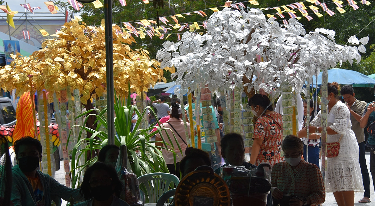 ซึ่งนักเสี่ย งโชคก็ไม่พลาดที่จะไปมุงดูธนบัตรที่ใบเงินและใบทอง เพื่อนำตัวเลขไปเสี่ย งโชค โดยที่พุ่มทอง ธนบัตรเป็นเลข 9 E 1 7 4 1 6 5 0 ส่วนพุ่มเงิน ธนบัตรเป็นเลข 8 F 8 8 4 2 1 5 2 หลังจากได้เลขเด็ดแล้ว ต่างก็ไปหาซื้อลอตเตอรี่จากแผงที่มาตั้งอยู่บริเวณวัด จนอาจารย์แป๊ะ ต้องประกาศผ่านเครื่องขย ายเสีย งว่า อย่าหลงงมงายมากนัก คนจะมีโชคลาภนั้นจะต้องมีบุญวาสนาด้วย
