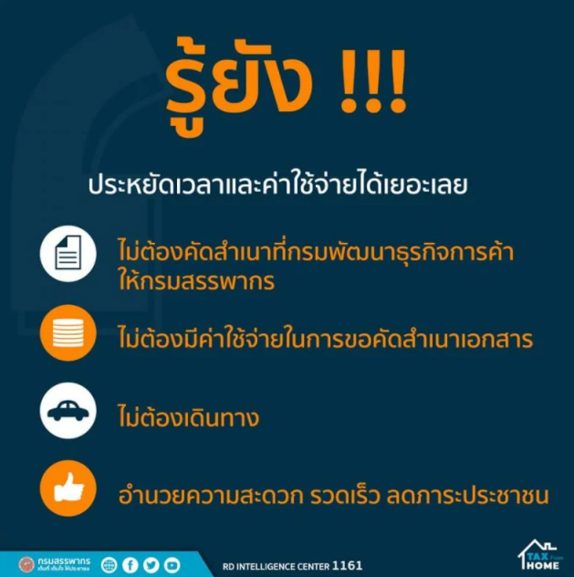 หากมีข้อสงสัยสามารถสอบถามข้อมูลเพิ่มเติมได้ที่ส้านักงานสรรพากรทุกแห่งทั่วประเทศหรือที่ศูนย์สารนิเทศสรรพากร (RD Intelligence Center) โทร. 1161