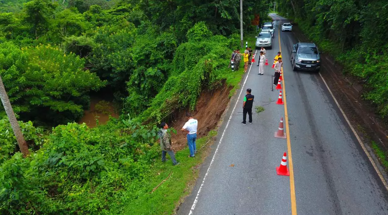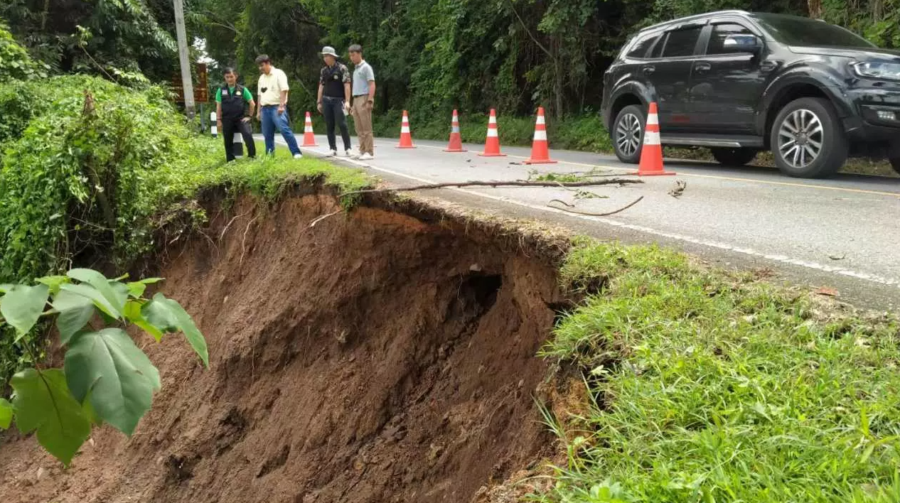 ช่วงเย็นวันที่ 28 กันย ายน ว่าที่ พ.ต.นรินทร์ ปิ่นสกุล หัวหน้าอุทย านแห่งชาติเขาใหญ่ นำ จนท.อุทย านฯ ช่วยกันเก็บเศษกิ่งไม้ ขุดดินทำร่องน้ำ ให้น้ำได้ไหลสะดวก หลังจากฝนตกลงมาอย่ างแรงบนอุทย านแห่งชาติเขาใหญ่ เมื่อคืนที่ผ่านมา และบางจุด ดินชุ่มน้ำ ก่อนหน้าก็มีพายุโนอึล ทำให้ฝนตกหลายวัน ดินอิ่มน้ำ ไม่ดูดซึม เมื่อฝนตกลงมาอีกก็ไหลลงสู่ด้านล่าง ซึ่งจุดที่ดินใต้ผิวถนนพังลงเพราะมีน้ำไหลผ่าน ด้านใต้ถนน กินพื้นที่มาเกือบ 1 ช่องทาง เป็นช่วงถนนที่อยู่สูงจากด้านข้าง ซึ่งเป็นคลองน้ำที่ไหลลงมาจากด้านบนอุทย านศาสนาเขาใหญ่ ไหลผ่านเข้าตัวเมืองปากช่อง ไปลงเขื่อนลำตะคอง สูงประมาณ เกือบ 30 เมตร มีความลึกมาก