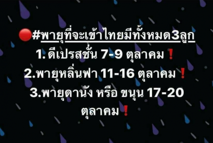 จากกรณีในโลกโซเชียลมีการเผยแพร่ข้อความว่า ไทยเตรียมรับมือต่อ พายุ 3 ลูกใหม่ ทำให้หลายคนตื่นตระหนกว่า น้ำจะท่วมใหญ่หรือไม่ ล่าสุด น.ส.กรรวี สิทธิชีวภาค รองอธิบดีกรมอุตุฯ รั กษ าราชการแทน อธิบดีกรมอุตุฯ เปิดเผยกับ จส.100 กรณีการส่งต่อพายุที่พัดเข้าประเทศไทยว่า ดีเปรสชั่นที่ขึ้นฝั่งและอ่อนกำลังลง ส่งผลทำให้มีฝนตกในหลายพื้นที่ตั้งแต่วันที่ 7-9 ตุลาคม ขณะนี้อ่อนกำลังลงเป็นร่องความกดอากาศต่ำทำให้เกิ ดฝนตกในวันนี้และพรุ่งนี้