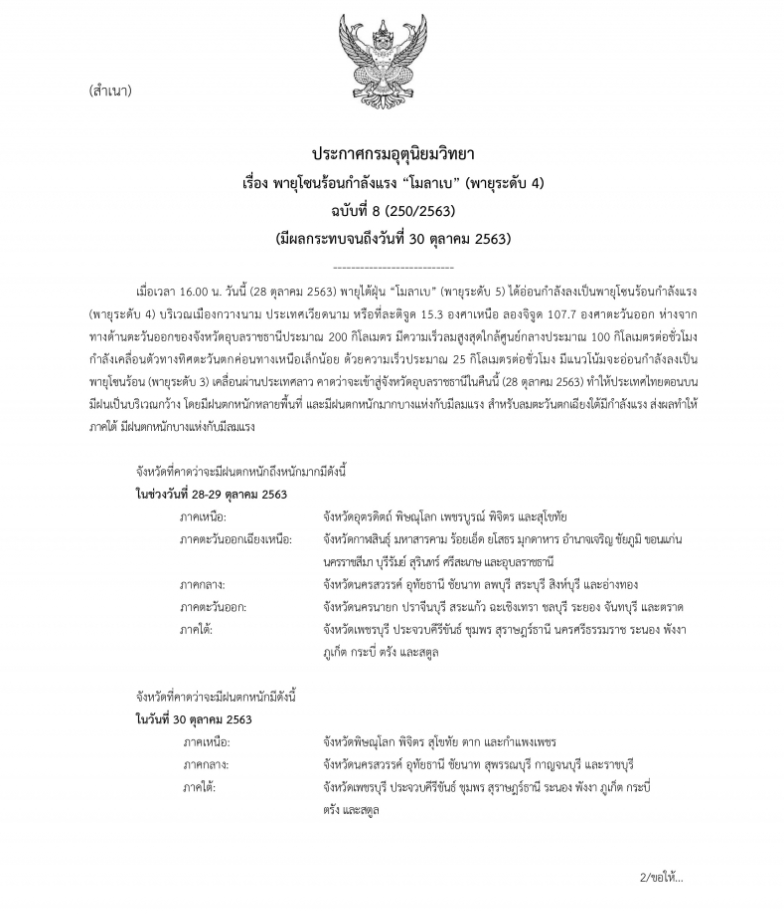28 ตุลาคม 2563 พายุไต้ฝุ่น โมลาเบ (พายุระดับ 5) ได้อ่อนกำลังลงเป็นพายุโซนร้อนกำลังแรง (พายุระดับ 4) บริเวณเมืองกวางนาม ประเทศเวียดนาม หรือที่ละติจูด 15.3 องศาเหนือ ลองจิจูด 107.7 องศาตะวันออก ห่างจากทางด้านตะวันออกของจังหวัดอุบลราชธานีประมาณ 200 กิโลเมตร มีความเร็วลมสูงสุดใกล้ศูนย์กลางประมาณ 100 กิโลเมตรต่อชั่ วโมง