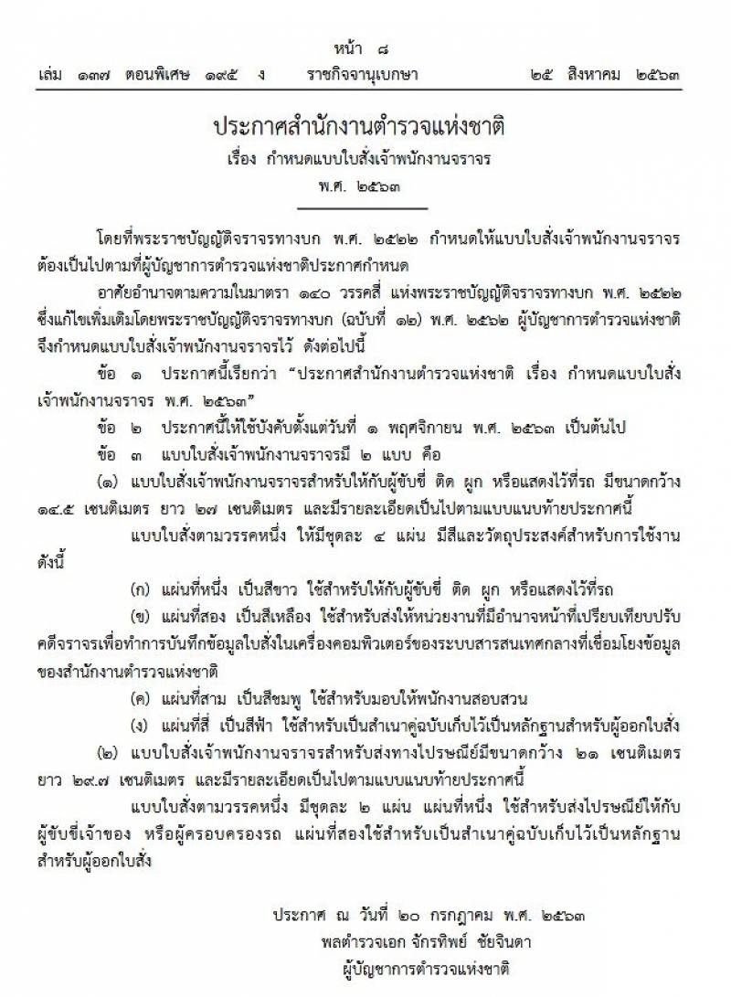 จากกรณีเว็บไซต์ราชกิจจานุเบกษา เผยแพร่ ประกาศสำนักงานตำรวจแห่งชาติ ออกโดย พล.ต.อ.จักรทิพย์ ชัยจินดา ผู้บัญชาการตำรวจแห่งชาติ(ผบ.ตร.) ความว่า ประกาศสำนักงานตำรวจแห่งชาติ เรื่องกำหนดแบบใบสั่งเจ้าพนักงานจราจร พ.ศ.2563 โดยที่พระราชบัญญัติจราจรทางบก พ.ศ.2522 กำหนดให้แบบ ใบสั่ง เจ้าพนักงานจราจร ต้องเป็นไปตามที่ผู้บัญชาการตำรวจแห่งชาติประกาศกำหนด ทั้ง นี้โดยได้เริ่มบังคับใช้ตั้งแต่วันที่ 1 พฤศจิกายน พ.ศ. 2563 ซึ่ง ใบสั่ง รูปแบบใหม่ที่สามารถจ่ายค่าปรับผ่านธนาคาร และสถานีตำรวจได้