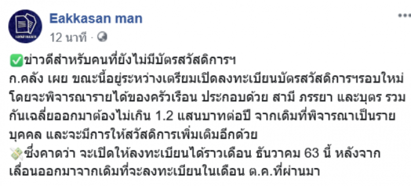 สำหรับคนที่กำลังรอคอยการเปิดให้ลงทะเบียนรอบใหม่ สำหรับบัตรสวัสดิการแห่งรัฐหรือ บัตรคนจน ล่าสุด เพจ Eakkasan man ได้โพสต์ข้อความระบุว่า ข่าวดีสำหรับคนที่ยังไม่มีบัตรสวัสดิการฯ ก.คลัง เผย ขณะนี้อยู่ระหว่างเตรียมเปิดลงทะเบียนบัตรสวัสดิการฯรอบใหม่
