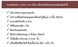 – เมื่อจ่ายเพิ่ม 3,500 บาทต่อเดือน ก็จะได้รับสิทธิประโยชน์เพิ่มเติมอีกมากมาย เช่น ที่จอดรถ บริการทำความสะอาด เครื่องดื่มฟรีเพิ่ม