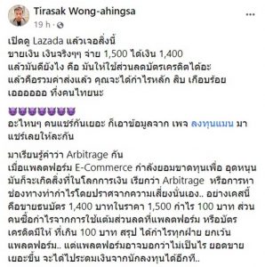 วันที่ 16 พฤศจิกายน 2563 เฟซบุ๊ก Tirasak Wong-ahingsa มีการโพสต์เล่าเรื่องราวมิติใหม่ของการขายออนไลน์ ขายเงินสด 1,400 บาท ในราคา 1,500 บาท เห็นแบบนี้แล้ว คำถามแรกที่หลายคนคิดขึ้นมาทันทีคือ แล้วคนซื้อจะได้อะไรเนี่ย ขาดทุนชัด ๆ 100 บาท ใครซื้อก็บ้าแล้ว