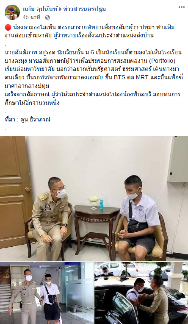 วันนี้เราจะพาเพื่อนมาติดตามอีกหนึ่งเรื่องราวสุดประทับใจ หลังจากที่มีผู้ใช้เฟซบุ๊กท่านหนึ่ง ได้ลงเรื่องราวระบุว่า น้องตา มองไม่เห็น ต่อรถมาจากพัทยาเพื่อขอสัมฯผู้ว่า ปทุมฯ ทำแฟ้มงานสอบเข้ามหาลัย ผู้ว่าทราบเรื่องสั่งรถประจำตำแหน่งส่งบ้าน