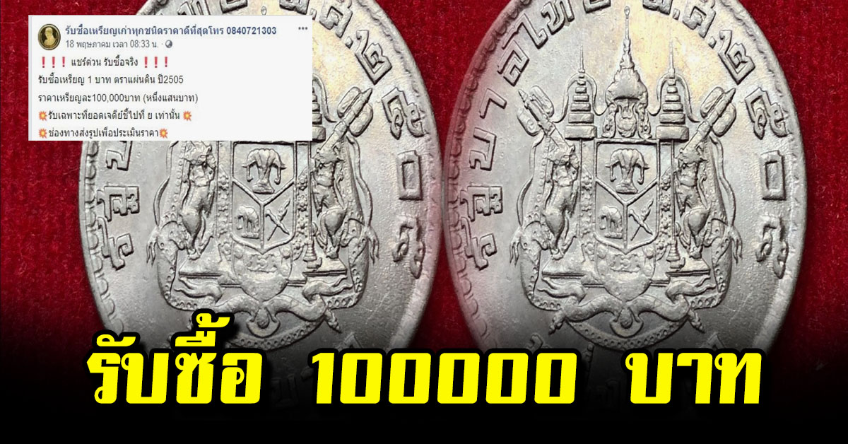 แชร์ด่วน รับซื้อจริง รับซื้อเหรียญ 1 บาท ตราแผ่นดิน ปี 2505 ราคาเหรียญละ100,000บาท (หนึ่งแสนบาท) รับเฉพาะที่ยอดเจดีย์ชี้ไปที่ ย เท่านั้น