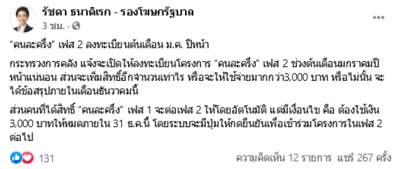 ล่าสุด น.ส.รัชดา ธนาดิเรก รองโฆษกประจำสำนักนายกรัฐมนตรี ได้โพสต์ข้อความผ่านเฟซบุ๊กแจ้งความคืบหน้าถึงโครงการนี้ว่า กระทรวงการคลัง แจ้งจะเปิดให้ลงทะเบียนโครงการ คนละครึ่ง เฟส 2 ช่วงต้นเดือนมกราคมปีหน้าแน่นอน ส่วนจะเพิ่มสิทธิ์อีกจำนวนเท่าไร หรือจะให้ใช้จ่ายมากกว่า3,000 บาท หรือไม่นั้น จะได้ข้อสรุปภายในเดือนธันวาคมนี้